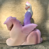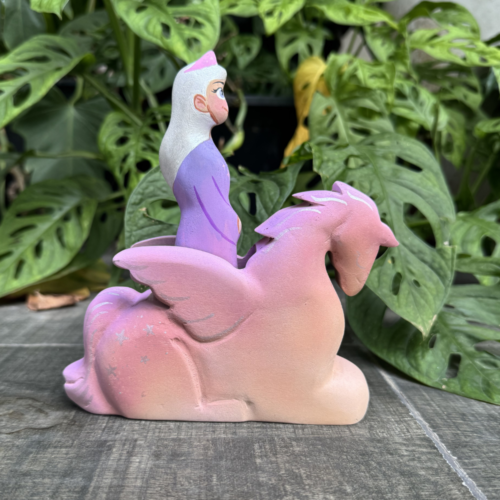 A dreamy Pegasus and her princess rider, guardians of skies, stars, and faraway lands. Hand-carved and painted in soft pastel tones, this magical pair inspires stories of adventure above the clouds.
